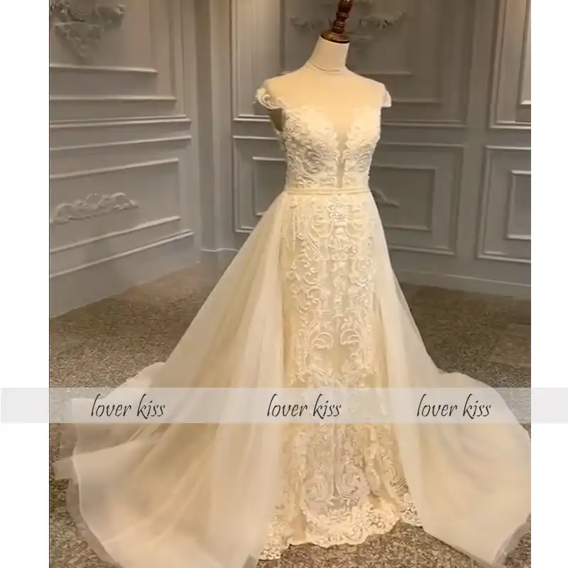Fashion Detachable Skirt Lace Mermaid Wedding Dresses See Through Sheer Applique Lace B Detachable Wedding Dress Lace Mermaid Wedding Dress Scoop Wedding Dress