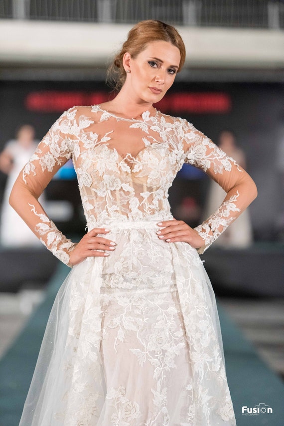 Boho Bridal Gown With Sleeves With Detachable Skirt Lace Etsy