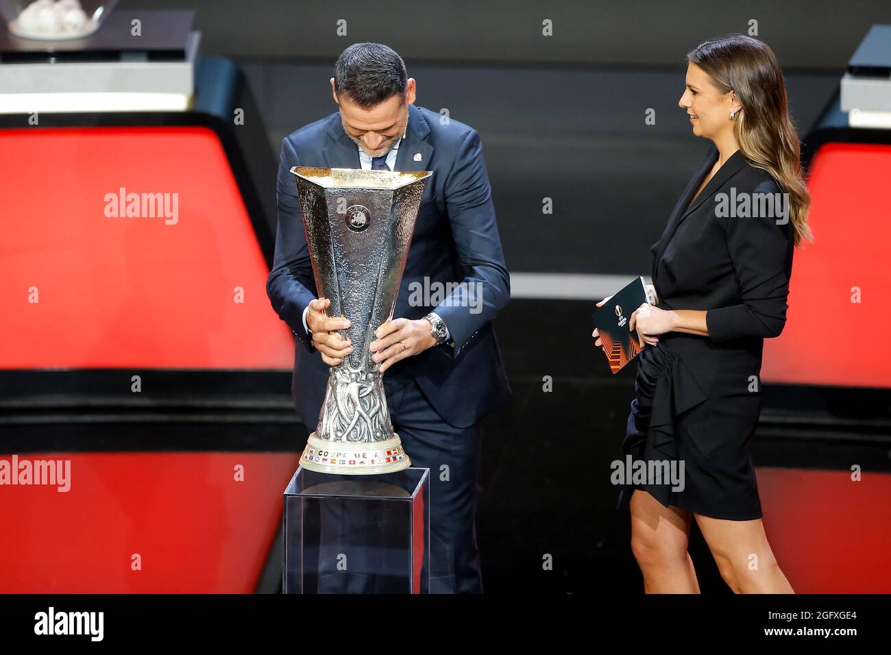 Istanbul Turkey August 27 Former Player Andres Palop Carrying The Uefa Europa League Trophy During The Uefa Europa League 2021 22 Group Stage Draw At The Halic Congress Center On August 27